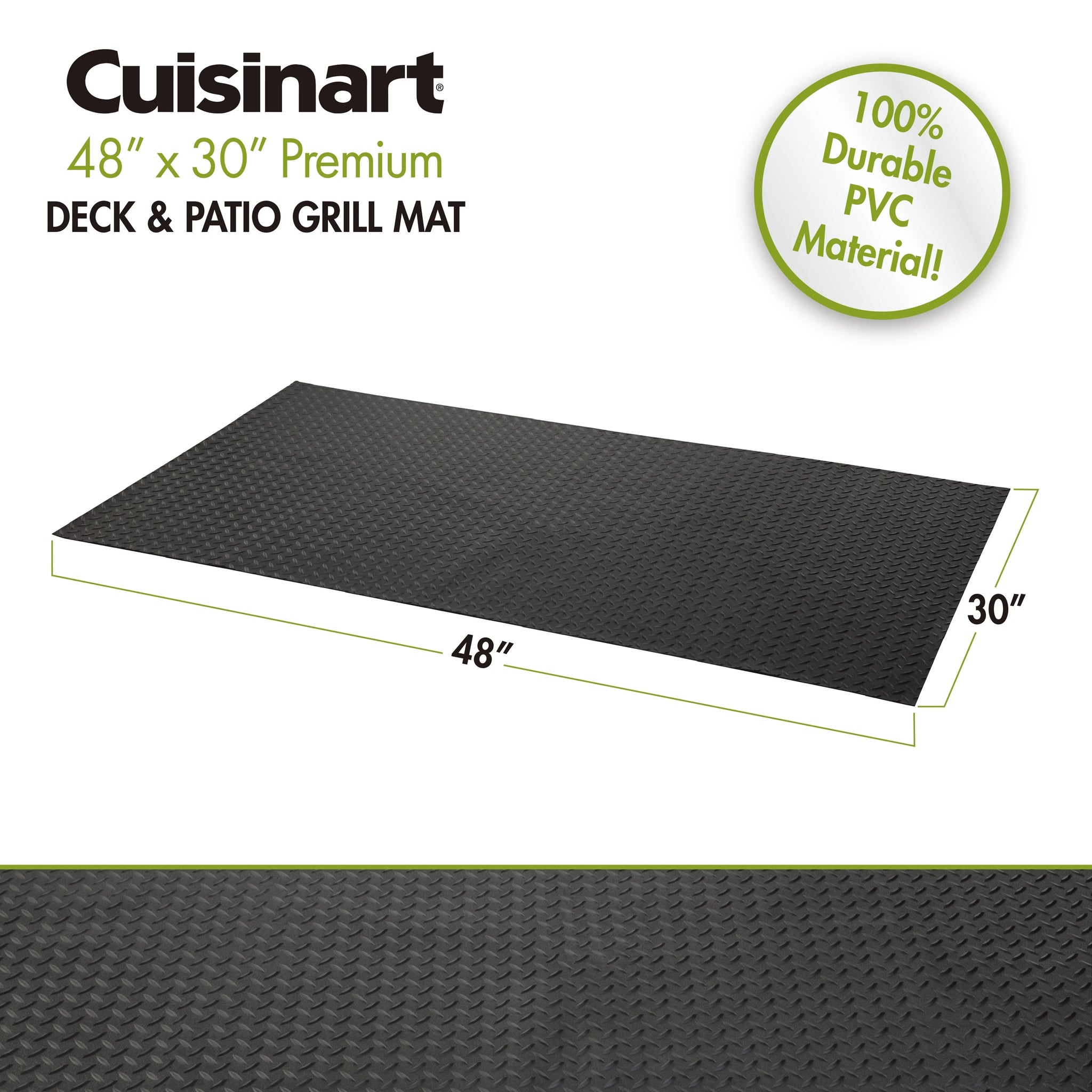 Protect your deck and patio from grease, spills and stains with the Cuisinart 48” X 30” Premium Grill and Smoker Mat. This non-slip grill mat measures 48" x 30" fitting most grills, smokers and griddles. The weight of the mat keeps it in place on your deck and the weather resistant material allows you to keep it outdoors all season long! When messes happen on the mat, you can simply take your garden hose and rinse it off, making it ready to use again. Unlike other mats, the Cuisinart 48” X 30” Premium Grill and Smoker Mat heavy-duty grill mat is made from 100% durable PVC material and will out last the competition.