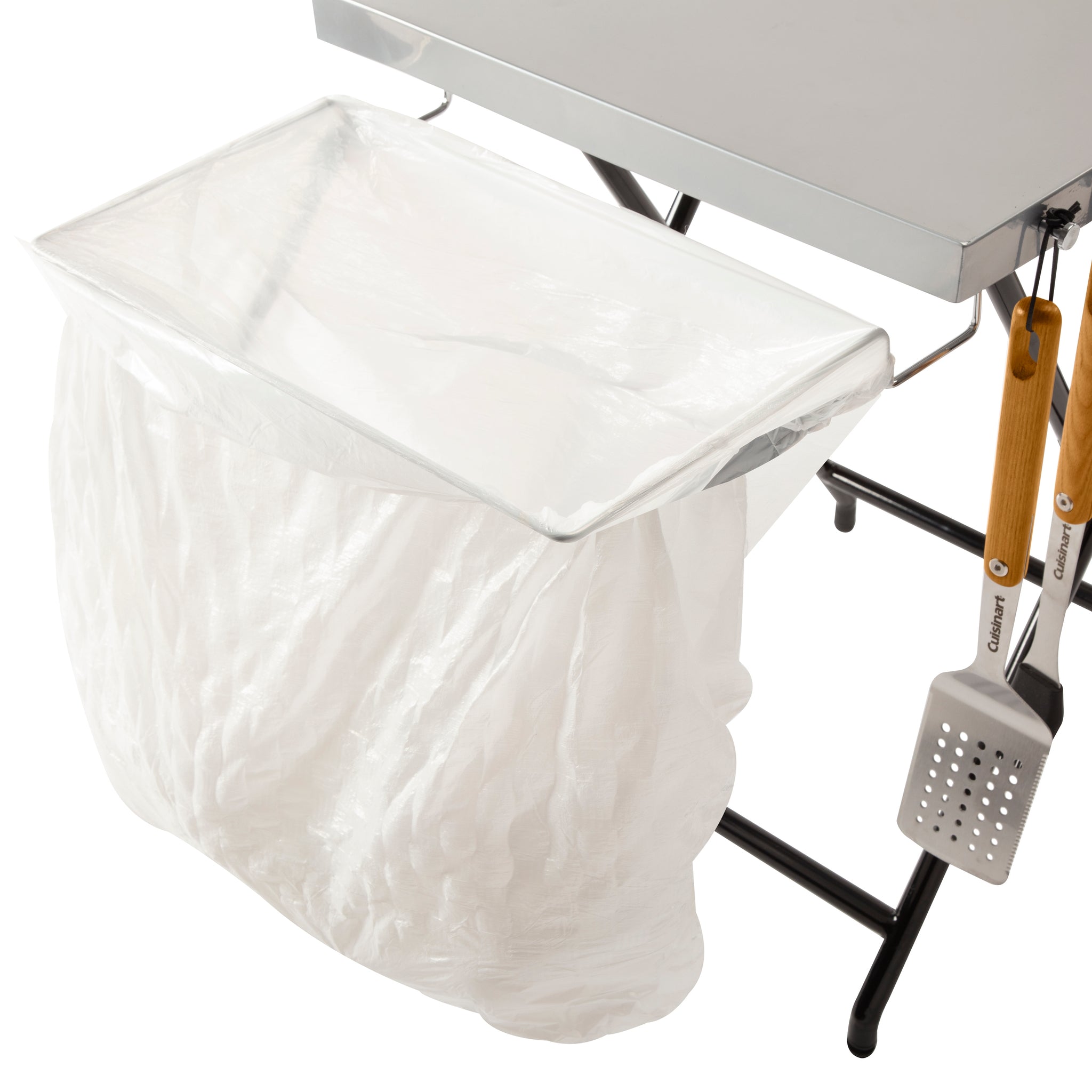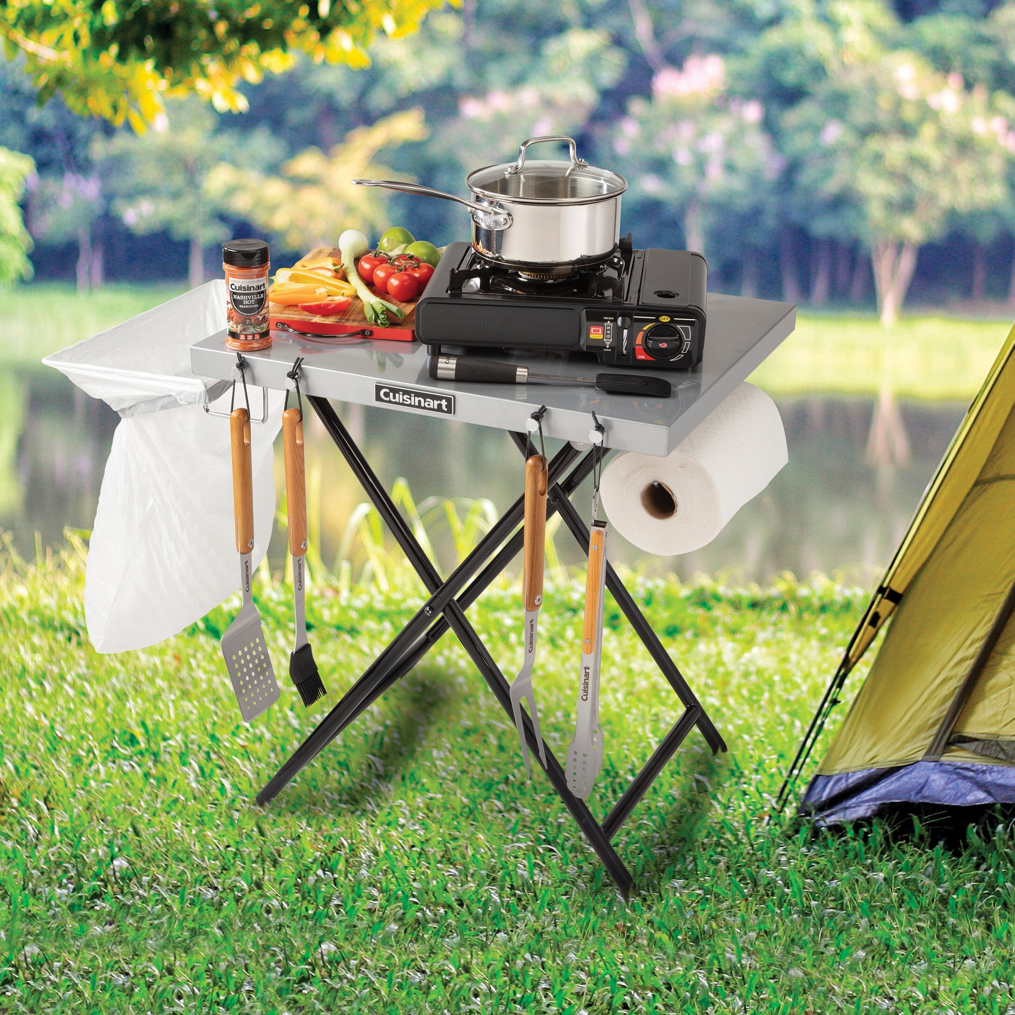 The Cuisinart Fold 'n Go Prep Table & Grill Stand is the perfect companion for your next camping or tailgating trip! The table features a spacious 24" x 20" steel work surface that provides plenty of room for food prep and will accommodate a variety of portable grills. With an easy-to-use x-frame design, the table sets up in seconds and can be easily folded and neatly packed away for future use. The legs also include a fastening strap that will keep them secure while in-transit. Also included with the table are an integrated trash bag holder on one side, and a paper towel holder on the other. The trash bag holder can accommodate 13-30 gallon trash bag, while the paper towel holder can fit up to a jumbo roll of towels. To keep your grilling tools handy, the table also features 4 tool hooks on the front for easy access while cooking.