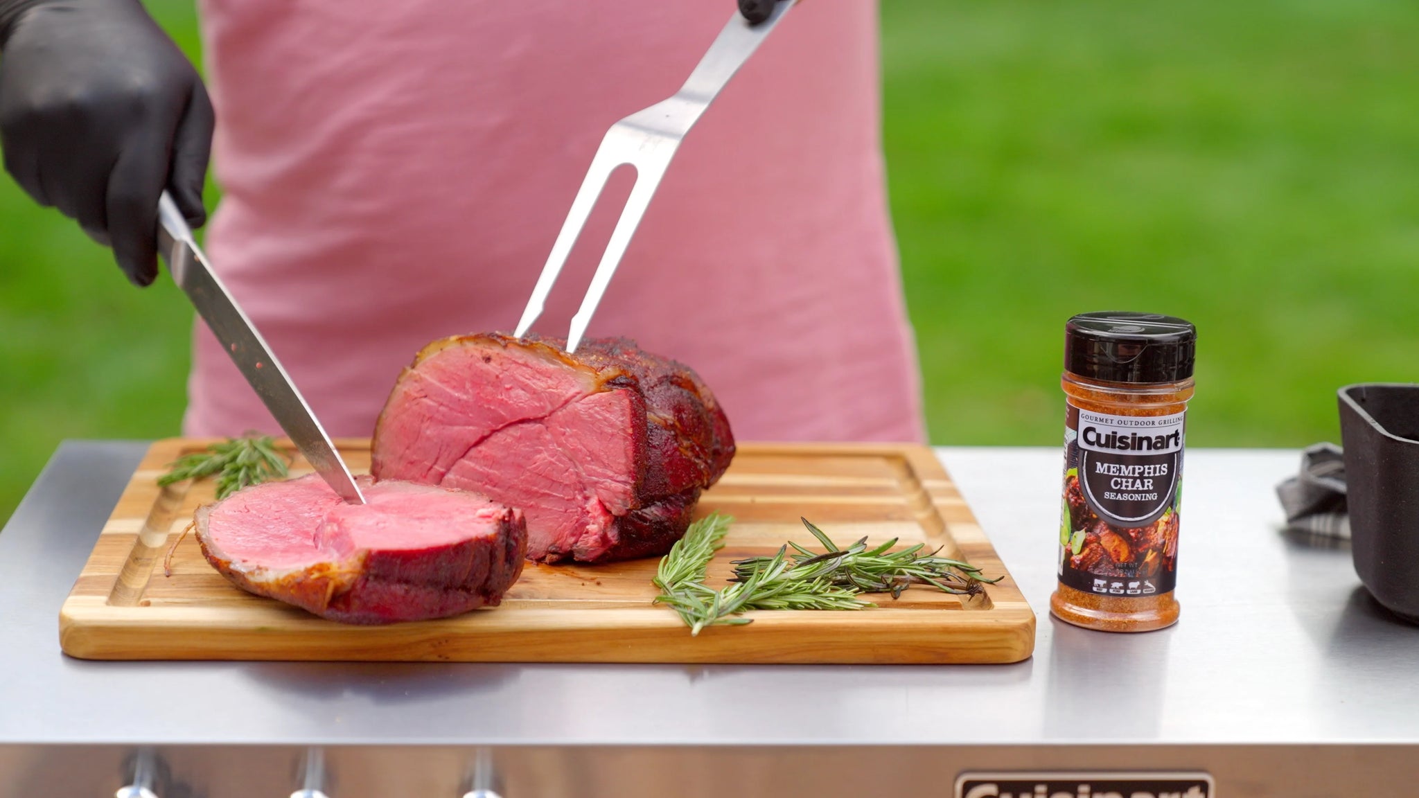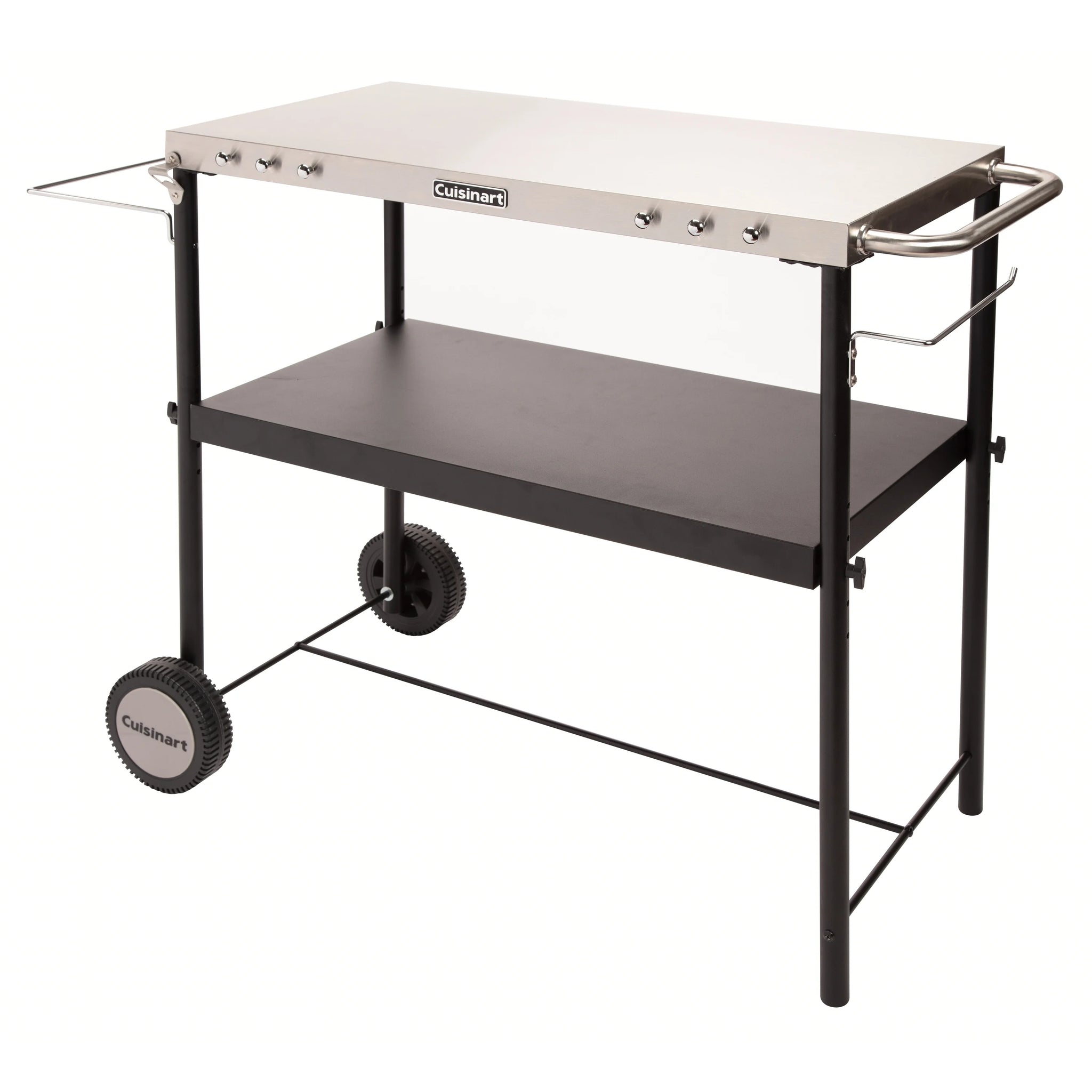 Expand your outdoor grill prep space with the Cuisinart Outdoor BBQ Prep Cart! Cut down on the trips to and from the kitchen by keeping all your BBQ essentials out by your grill or smoker. The prep table features a spacious 36" x 18" stainless steel work surface that offers plenty of space for prepping meats, fish, chicken, veggies, and so much more. Easily remove food scraps from the work surface by brushing them directly in to the garbage bag holder, which can accommodate up to 30 gallon size trash bags. The prep cart also come equipped with a paper towel holder that can fit up to a jumbo roll of paper towels. The height adjustable shelf sits between 18-24" inches off the ground, allowing you to position exactly where you need it. The shelf is perfect for holding plates, utensils, grill fuel like charcoal and wood pellets, as well as any other BBQ essentials you need by your grill or smoker. Keep up to 6 BBQ tools within quick reach by utilizing the tool hooks on the front of the work surface. Please Note: Outdoor grilling products do not ship to Alaska & Hawaii. International shipping is not offered.