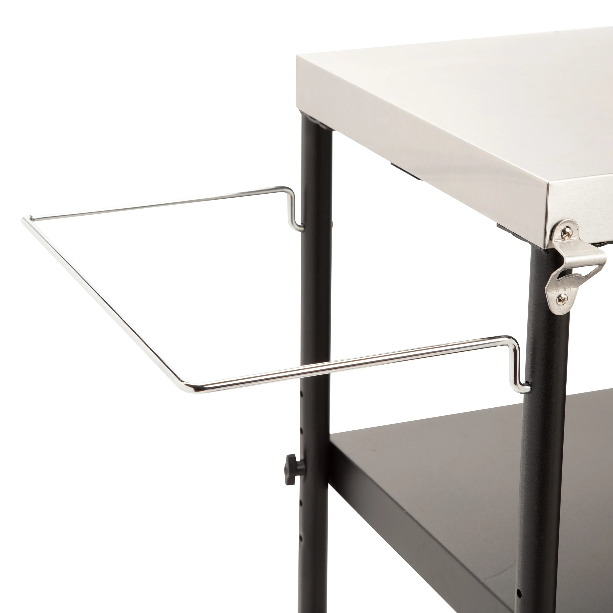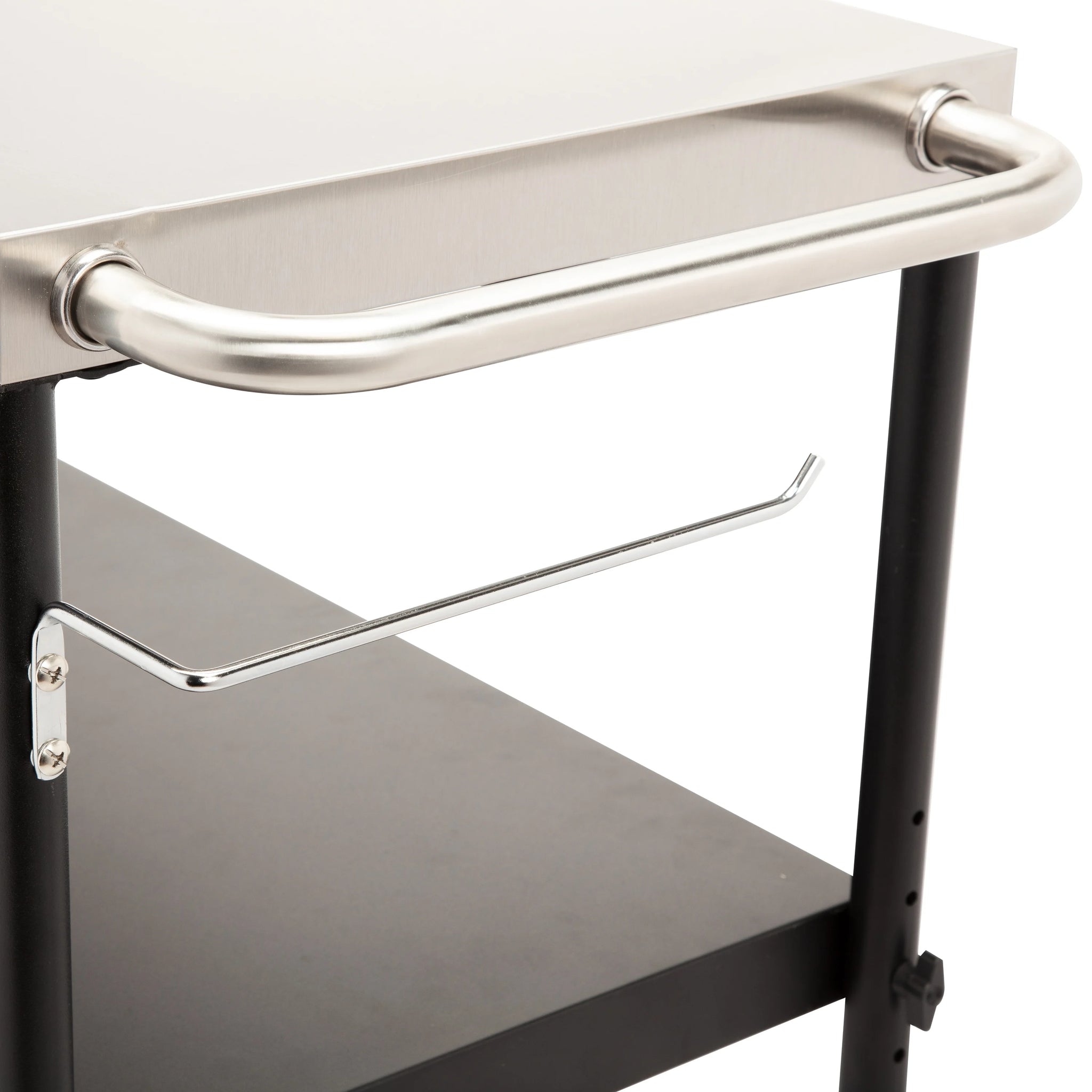 - STAINLESS STEEL WORK SURFACE: The prep table features a spacious 36" x 18" stainless steel work surface for prepping meats, fish, veggies and so much more! ADJUSTABLE STORAGE SHELF: The storage shelf has 5 adjustable positions, allowing you to place the shelf exactly where you need it PAPER TOWEL HOLDER: The paper towel holder can accommodate a jumbo roll of paper towels and is conveniently located to the right of the work surface GARBAGE BAG HOLDER: The trash bag holder makes it easy to remove food scraps and trash from the work surface and accommodates 13-30 gallon trash bags TOOL HOOKS: The 6 tool hooks provide ample space to keep all of your BBQ tools handy while grilling